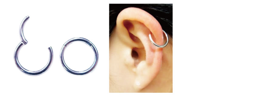 ファーストピアスを外して間もないホールの内部はまだデリケートで、アクセサリーピアスの細い先端がホール内に当たるだけで簡単に傷ついてしまいます。しばらくはファーストピアスに似た軸の太いピアス、リング型スリーパーをオススメします。画像のようなタイプであればタオルなどに引っかけてホールを傷つけてしまう心配がなく、慣れていない方でも出し入れしやすくセカンドピアスに適しています。