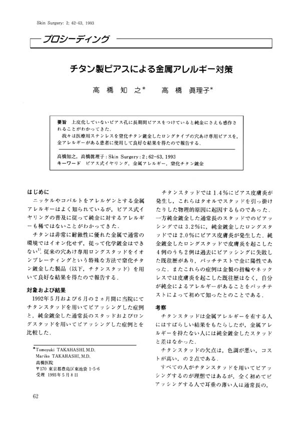 Skin Surgery Vol.2 No.1 日本臨床皮膚外科学会誌 November 1993 62~63頁